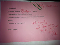In case you can't read it, it is a note from her teacher dated May 11/12...it says she cleaned out Maddie's desk and found some papers to get finished at home and send when finished...Now, even though it says "No Rush!" I am thinking she meant before the end of the year??!!! Man...anyways, I asked her why she did that and she simply said "Because she didn't want to do it!" Easy enough...So, if you are looking for me I will be hiding under my bed because I don't want to do anything anymore!!!